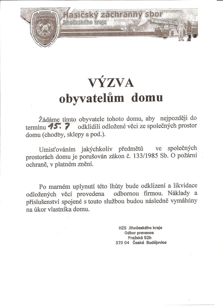 HZS Jihočeského kraje se v poslední době několikrát setkal s různými „výzvami, prohlášeními či letáky“, jejichž autorem jihočeský sbor není. Rádi bychom na tuto situaci reagovali. Podobné výzvy, které jsme objevili nejčastěji v bytových domech, obsahují informace nebo příkazy z oblasti požární ochrany. Nelze říci, že by napsané údaje byly vždy nepravdivé nebo v rozporu s legislativou. Problém je ten, že nejsou oficiálním stanoviskem HZS Jihočeského kraje, zneužívají znak HZS ČR, jméno jihočeského sboru a často i signifikaci. Jakým postupem vydává HZS Jihočeského kraje svá oficiální prohlášení? Naprostá většina všech prohlášení, rad, výzev a doporučení pro obyvatelstvo je po schválení příslušnými služebními funkcionáři vydávána cestou tiskové mluvčí. Jsou rozesílána médiím a zároveň zveřejňována na webových stránkách HZS Jihočeského kraje www.hzsjck.cz, kde jsou trvale k vyhledání (HZS Jihočeského kraje nevyužívá žádnou ze sociálních sítí). Ostatní prohlášení či doporučení pro veřejnost mohou být realizována cestou některých dalších příslušníků HZS Jihočeského kraje, kteří využívají cestu přes orgány státní správy a samosprávy. Pro obě skupiny vydávaných prohlášení platí, že jsou na hlavičkovém papíře, se schváleným záhlavím a signifikací, kde je jasně patrné, kdo konkrétně dané prohlášení zpracoval. V napodobeninách, které jsme objevili, jsou všechny tyto insignie včetně znaku HZS ČR zneužity a autoři těchto výzev nepostupují dle platných zákonů. Pokud se setkáte s výzvou či prohlášením, které Vás bude nabádat k určitému jednání, a nebudete si jisti, zda se jedná o oficiální prohlášení jihočeského profesionálního sboru, obraťte se na níže uvedený kontakt. Zdroj: Vendula Matějů, tisková mluvčí - HZS Jihočeský kraj Foto: HZS Jihočeský kraj